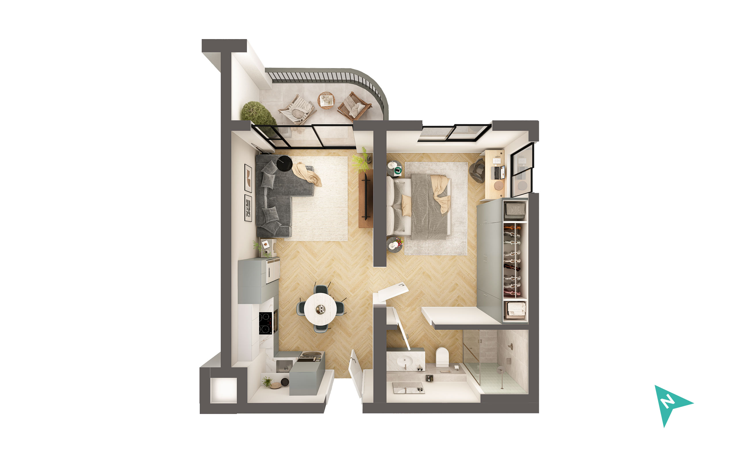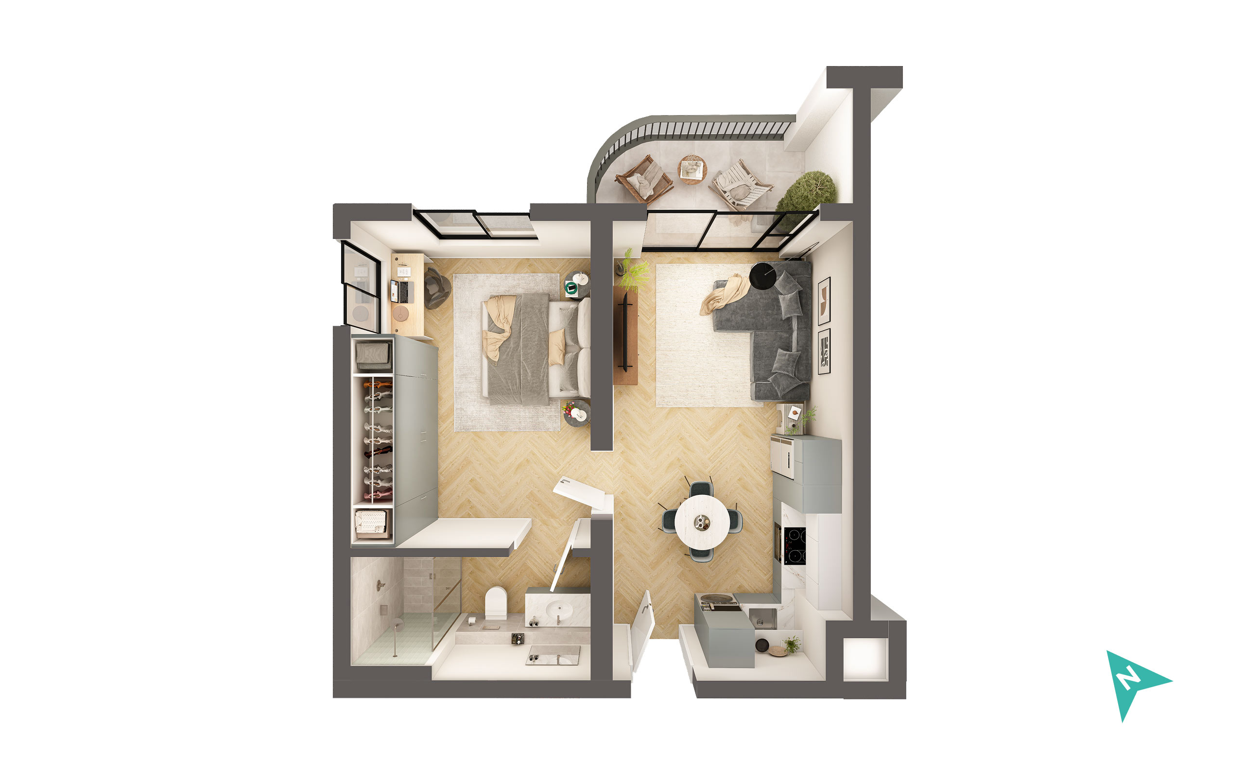 511 | SOLD | 1 - bed | Park | 45 m2 | 6 m2 | 51 m2 | R3 617 |